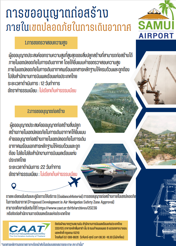 การดำเนินการปลูกสร้างสิ่งปลูกสร้าง อาคารต่าง ๆ รวมไปถึงการปลูกไม้ยืนต้นในบริ เวณดังกล่าวต้องได้รับการอนุญาตจากสำนักงานการบินพลเรือนแห่งประเทศไทย