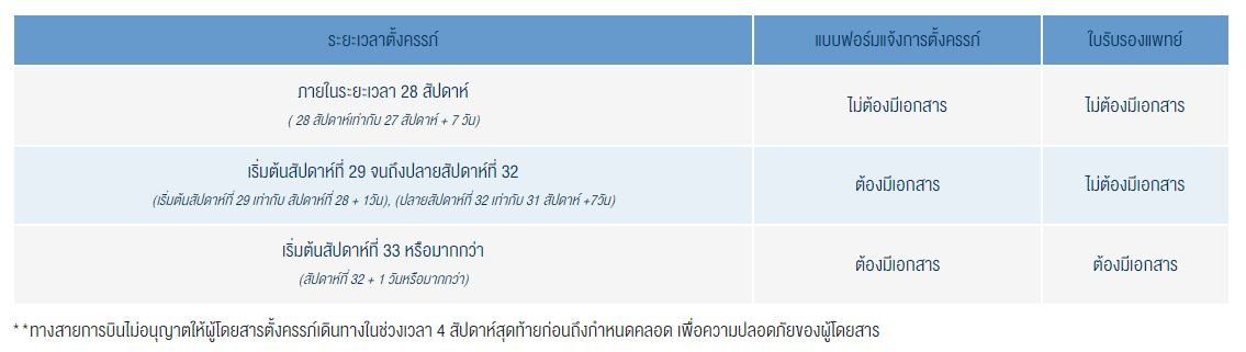 ความปลอดภัยของผู้โดยสารและบุตรเป็นสิ่งสำคัญสำหรับเรา ทางสายการบินขอแนะนำให้ผู้โดยสารที่ตั้งครรภ์ขอคำปรึกษาจากแพทย์ก่อนวางแผนการเดินทางเพื่อป้องกันความเสียงที่อาจจะเกิดขึ้นกับทั้งผู้โดยสารและบุตรในครรภ์ และเพื่อไม่ให้เกิดความล่าช้าในการเช็คอินท่านผู้โดยสารอาจจำเป็นต้องนำเอกสารทางการแพทย์อื่นๆ ติดตัวสำหรับการเดินทาง เอกสารที่ท่านจะต้องแสดงจะขึ้นอยู่กับระยะการตั้งครรภ์ของท่าน โดยท่านสามารถตรวจสอบได้ตามตารางด้านล่าง
